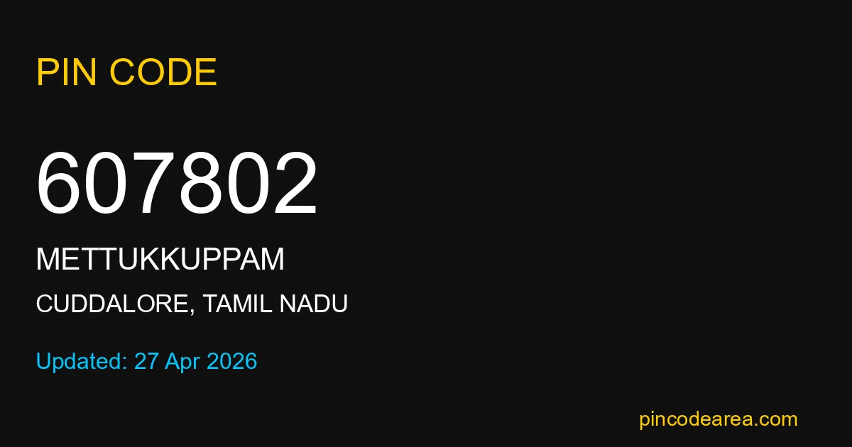 607802 PIN Code is assigned to Mettukkuppam Post Office located in Cuddalore district of Tamil Nadu. It helps identify the exact delivery area for postal and courier services.