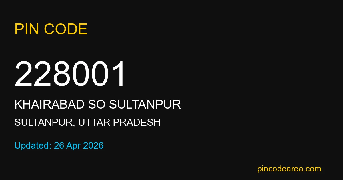 228001 PIN Code is assigned to Khairabad SO Sultanpur Post Office located in Sultanpur district of Uttar Pradesh. It helps in identifying the exact delivery area.