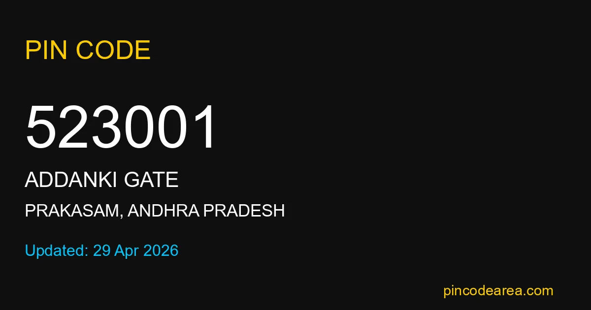523001 PIN Code is assigned to Addanki Gate Post Office located in Prakasam district of Andhra Pradesh. It helps identify the exact delivery area for postal and courier services.