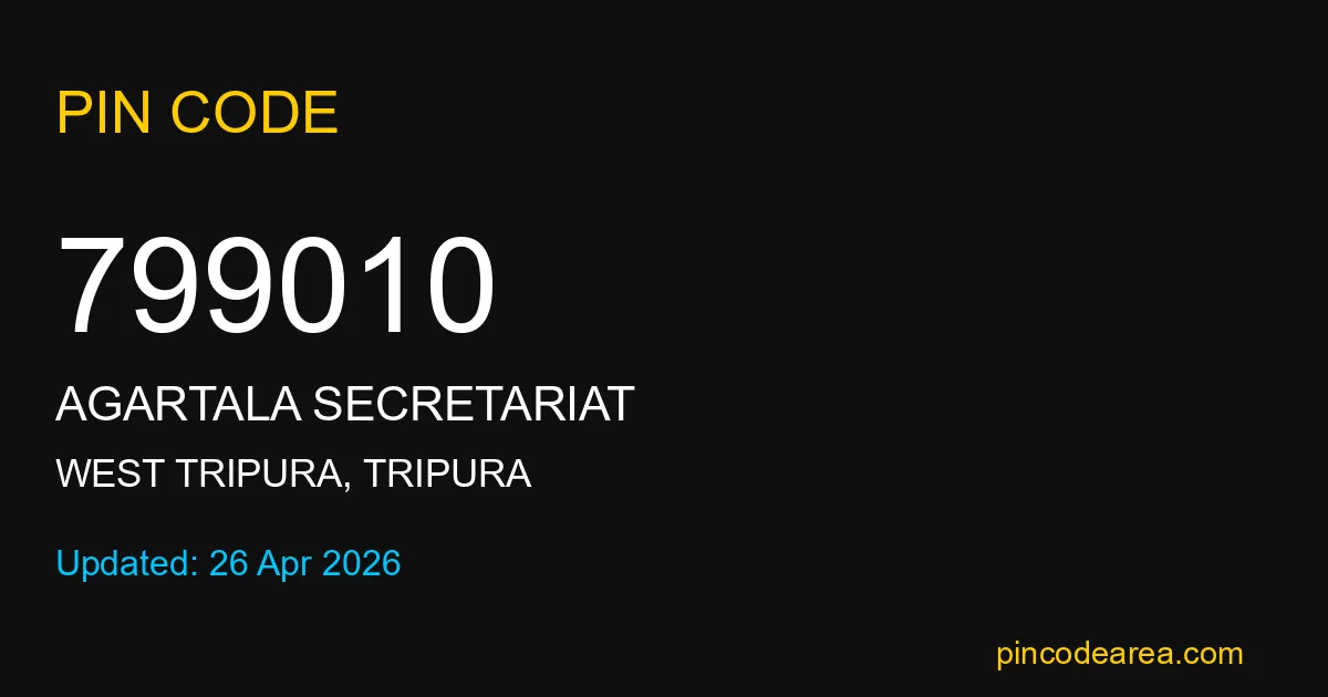 If you are searching for accurate location details, 799010 helps identify the exact postal region of Agartala Secretariat in Tripura.