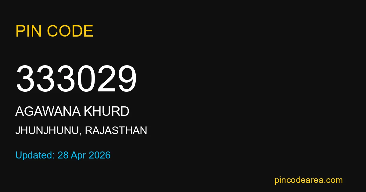 333029 PIN Code is assigned to Agawana Khurd Post Office located in Jhunjhunu district of Rajasthan. It helps identify the exact delivery area for postal and courier services.