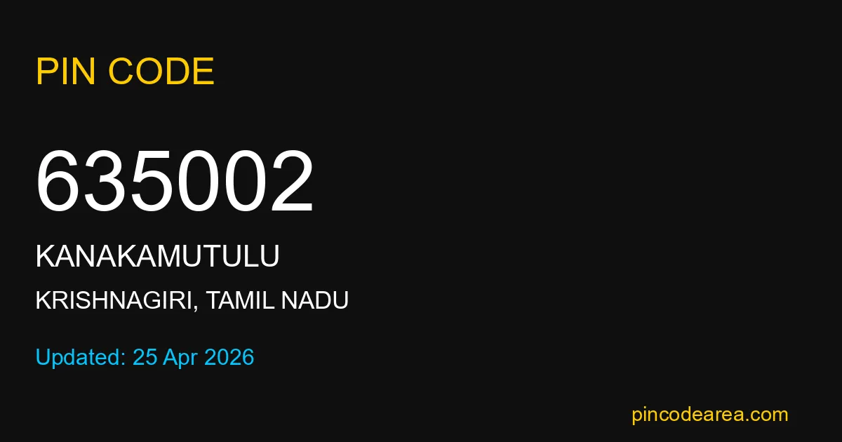 635002 PIN Code is assigned to Kanakamutulu Post Office located in Krishnagiri district of Tamil Nadu. It helps in identifying the exact delivery area.