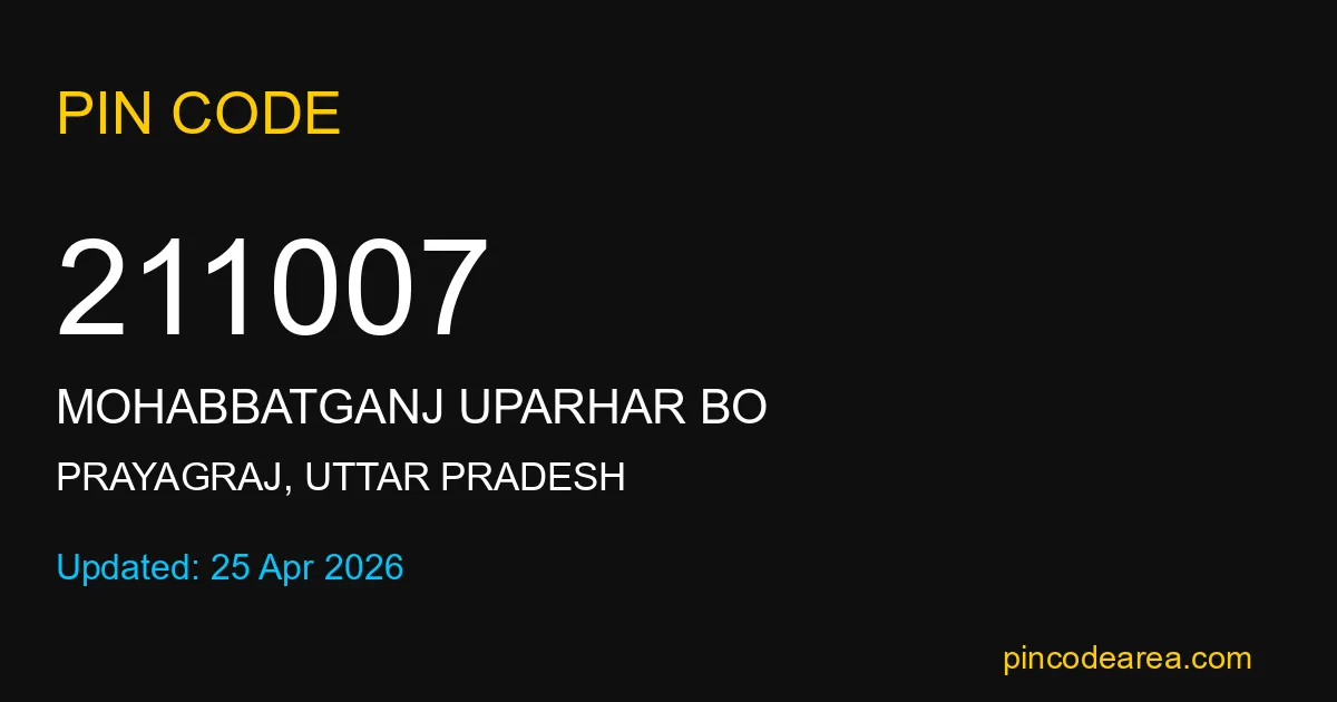 211007 PIN Code belongs to Mohabbatganj Uparhar BO Post Office in Prayagraj district of Uttar Pradesh, India. This area mainly includes local residential and rural regions where India Post ensures timely mail and parcel delivery services.