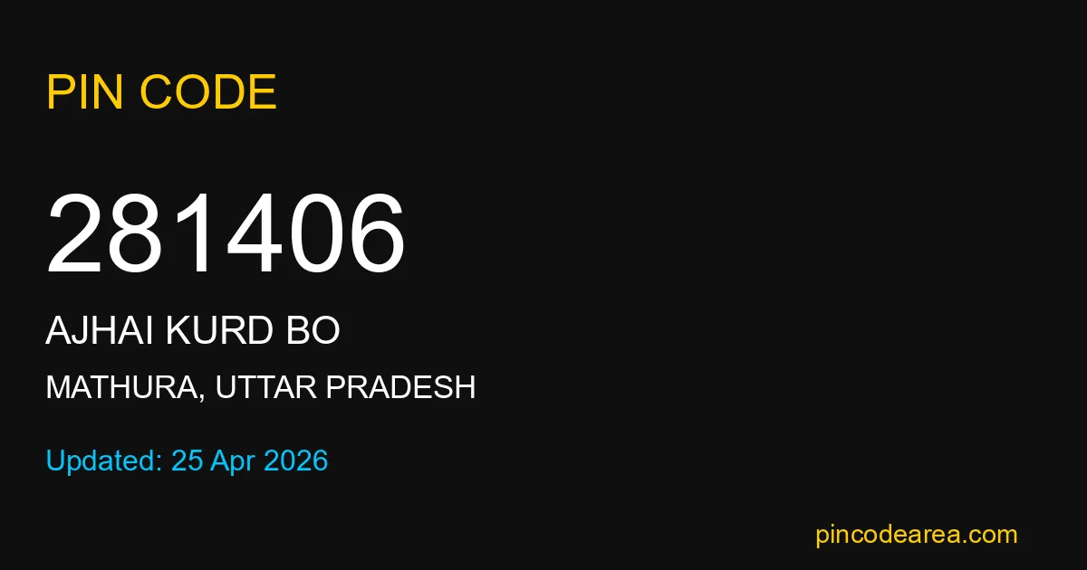 281406 PIN Code belongs to Ajhai Kurd BO Post Office in Mathura district of Uttar Pradesh, India. This area mainly includes local residential and rural regions where India Post ensures timely mail and parcel delivery services.