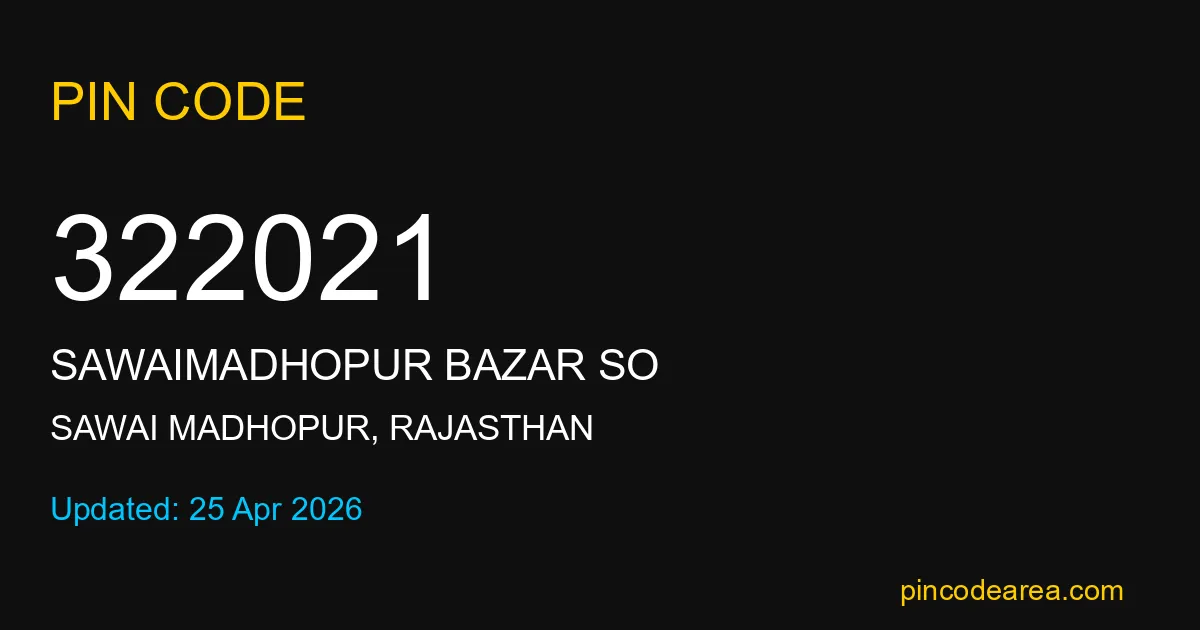 322021 PIN Code is assigned to Sawaimadhopur Bazar SO Post Office located in Sawai Madhopur district of Rajasthan. It helps in identifying the exact delivery area.