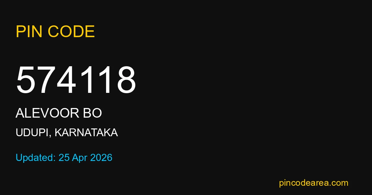 574118 PIN Code is assigned to Alevoor BO Post Office located in Udupi district of Karnataka. It helps in identifying the exact delivery area.