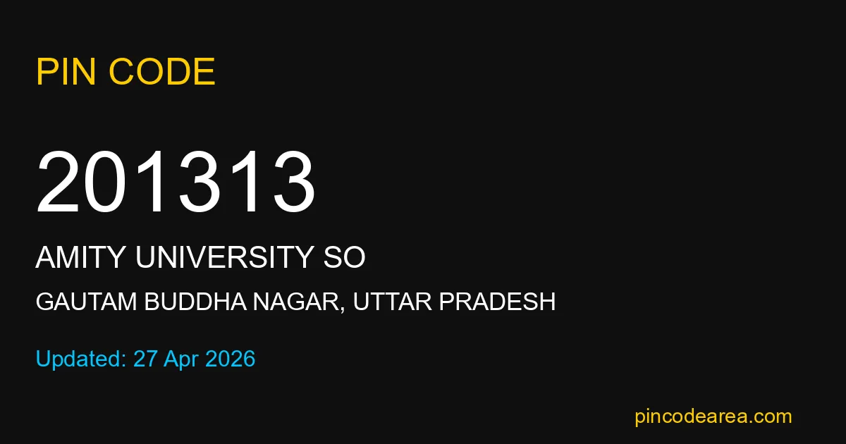 201313 PIN Code is assigned to Amity university SO Post Office located in Gautam Buddha Nagar district of Uttar Pradesh. It helps identify the exact delivery area for postal and courier services.