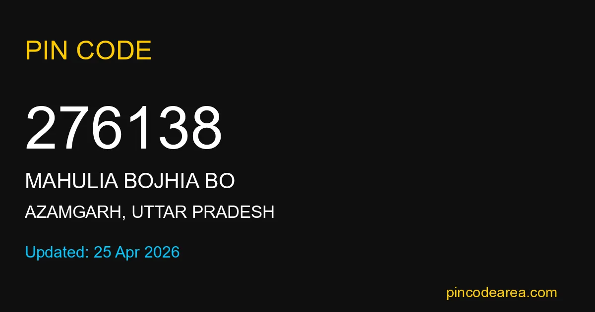 276138 PIN Code belongs to Mahulia Bojhia BO Post Office in Azamgarh district of Uttar Pradesh, India. This area mainly includes local residential and rural regions where India Post ensures timely mail and parcel delivery services.