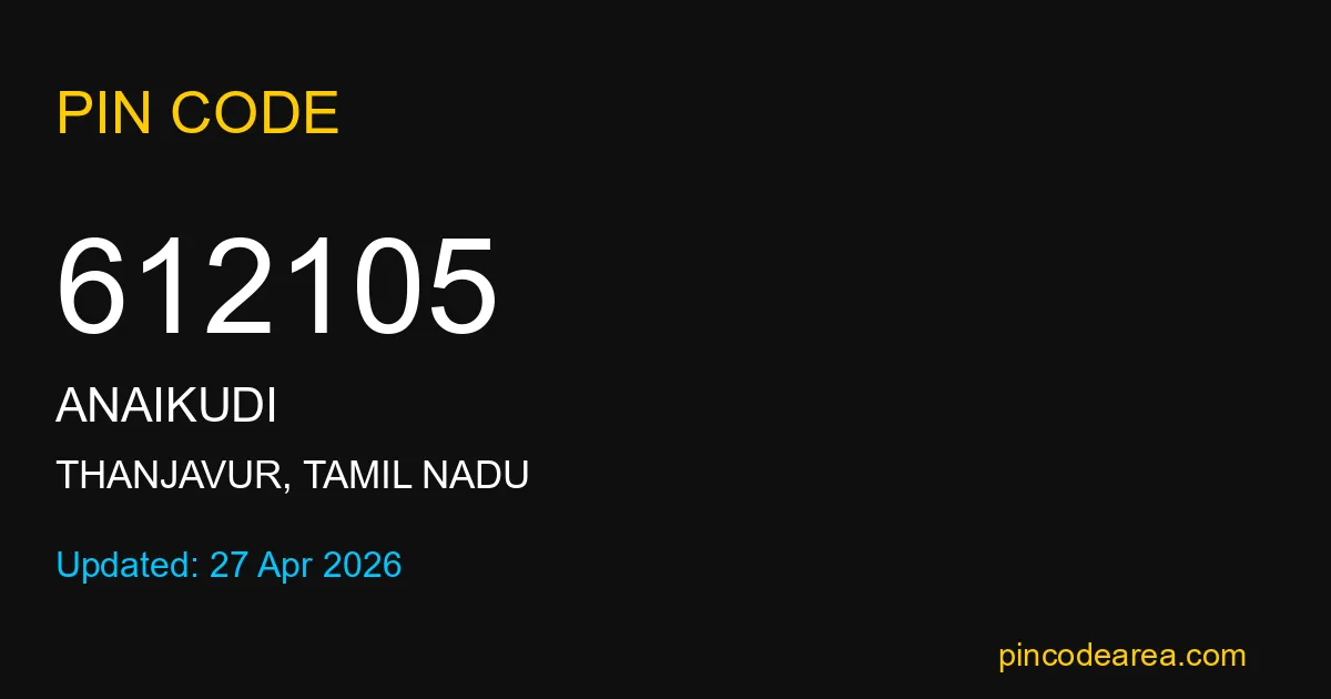 612105 PIN Code is assigned to Anaikudi Post Office located in Thanjavur district of Tamil Nadu. It helps identify the exact delivery area for postal and courier services.