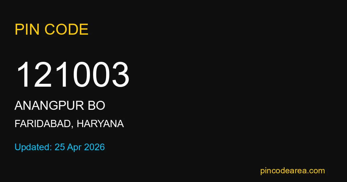 121003 PIN Code is assigned to Anangpur BO Post Office located in Faridabad district of Haryana. It helps in identifying the exact delivery area.