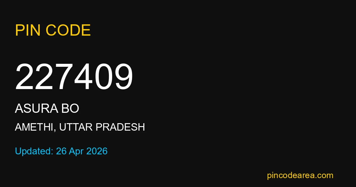 227409 PIN Code is assigned to Asura BO Post Office located in Amethi district of Uttar Pradesh. It helps identify the exact delivery area for postal and courier services.