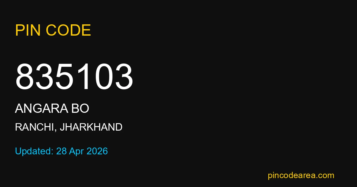835103 PIN Code is assigned to Angara BO Post Office located in Ranchi district of Jharkhand. It helps identify the exact delivery area for postal and courier services.
