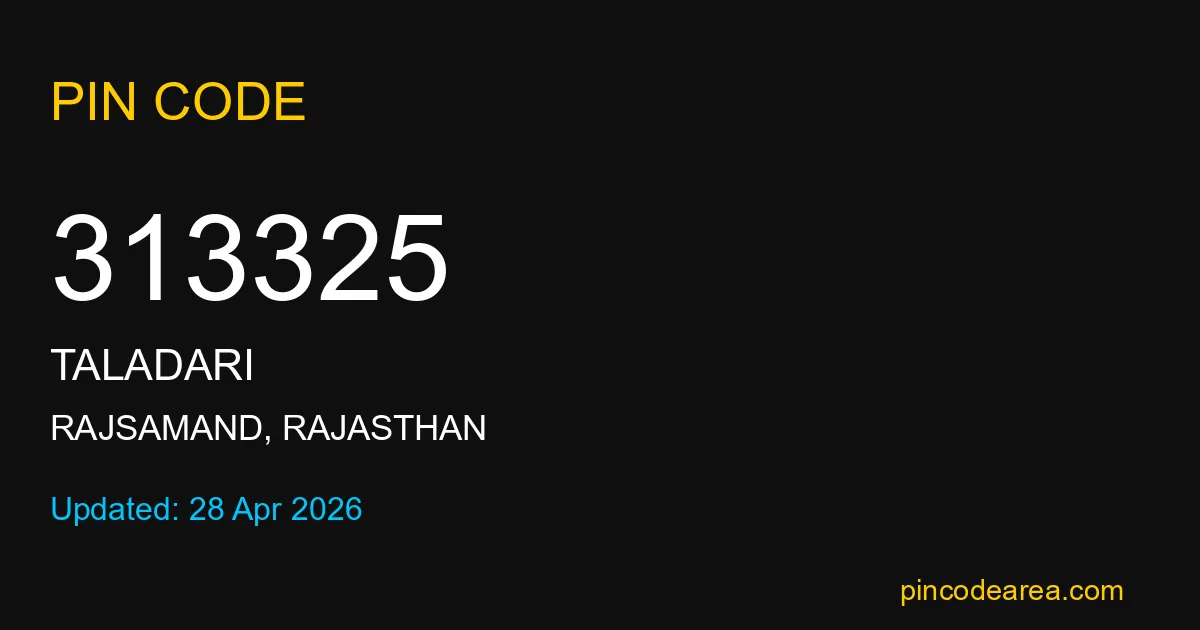 313325 PIN Code is assigned to Taladari Post Office located in Rajsamand district of Rajasthan. It helps identify the exact delivery area for postal and courier services.