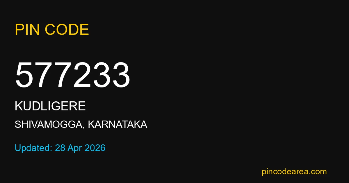 577233 PIN Code is assigned to Kudligere Post Office located in Shivamogga district of Karnataka. It helps identify the exact delivery area for postal and courier services.