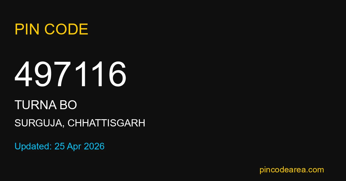 497116 PIN Code is assigned to Turna BO Post Office located in Surguja district of Chhattisgarh. It helps in identifying the exact delivery area.