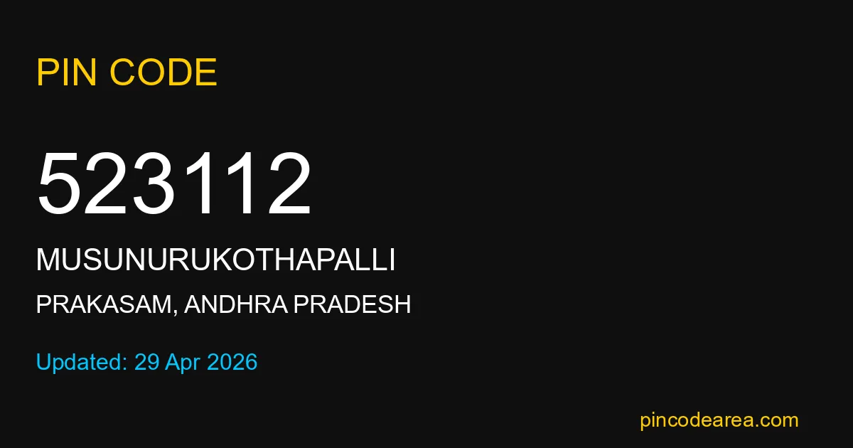 523112 PIN Code is assigned to Musunurukothapalli Post Office located in Prakasam district of Andhra Pradesh. It helps identify the exact delivery area for postal and courier services.