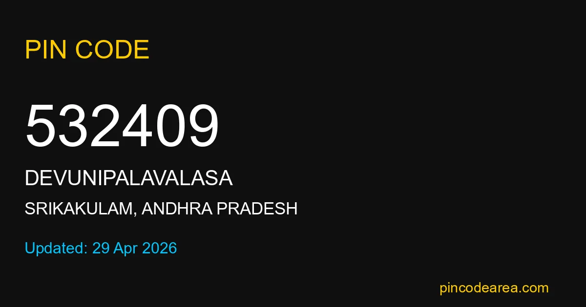532409 PIN Code belongs to Devunipalavalasa Post Office in Srikakulam district of Andhra Pradesh, India. This area mainly includes local residential and rural regions where India Post ensures timely mail and parcel delivery services.