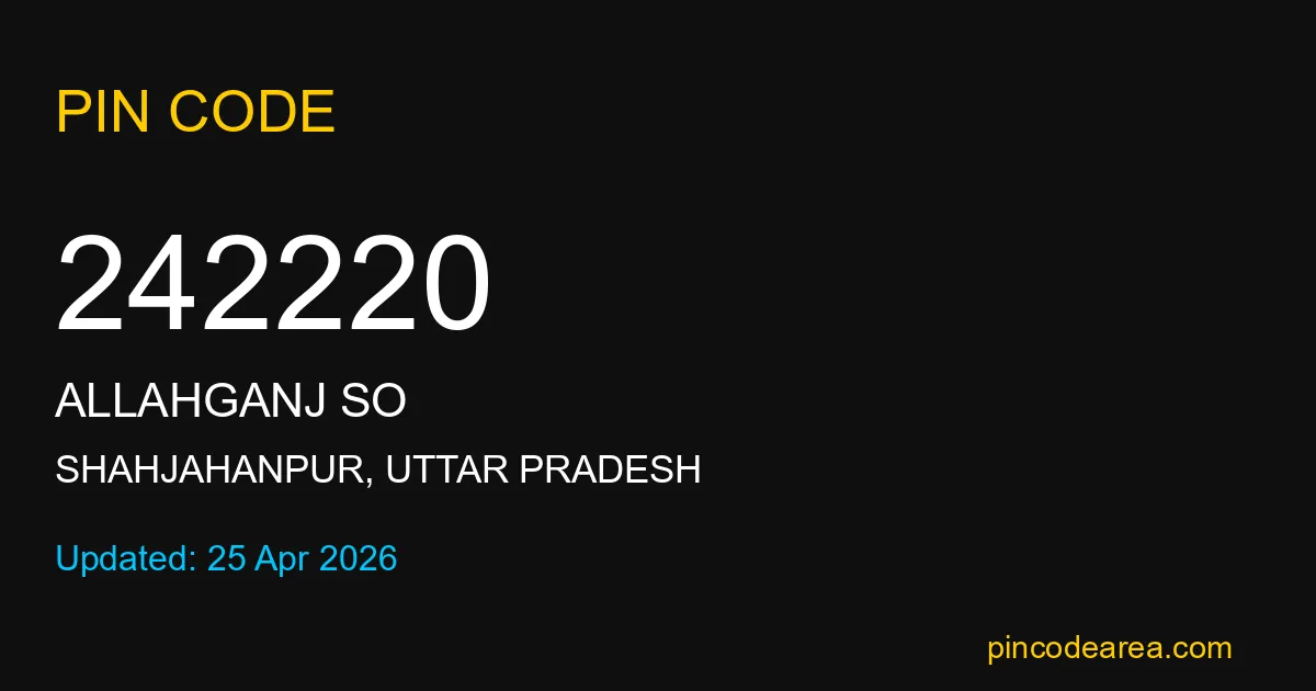 242220 PIN Code is assigned to Allahganj SO Post Office located in Shahjahanpur district of Uttar Pradesh. It helps in identifying the exact delivery area.