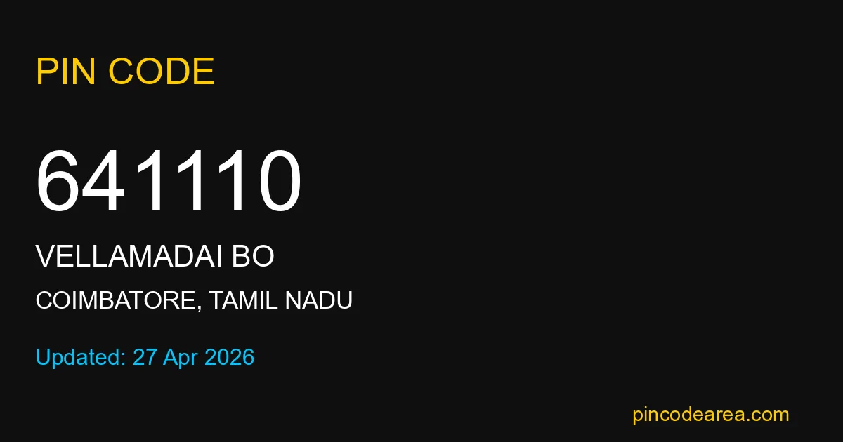 641110 PIN Code is assigned to Vellamadai BO Post Office located in Coimbatore district of Tamil Nadu. It helps identify the exact delivery area for postal and courier services.