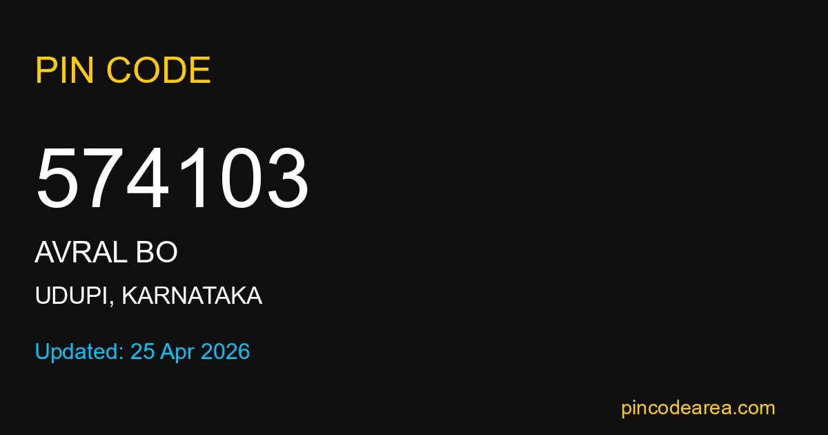 574103 PIN Code belongs to Avral BO Post Office in Udupi district of Karnataka, India. This area mainly includes local residential and rural regions where India Post ensures timely mail and parcel delivery services.