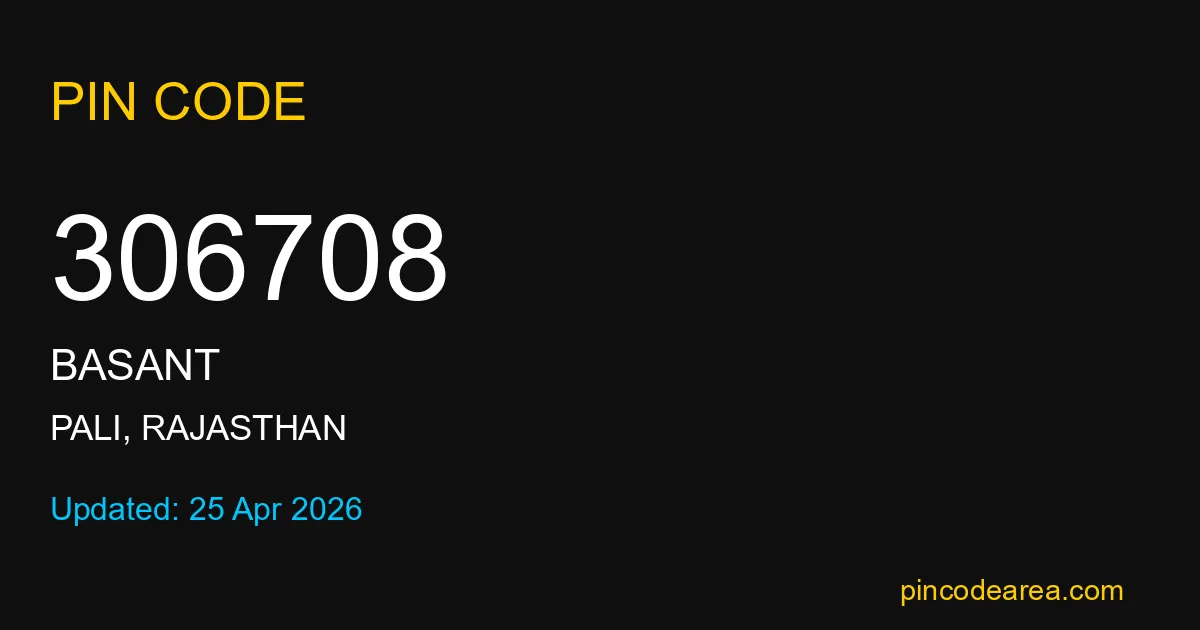 306708 PIN Code is assigned to Basant Post Office located in Pali district of Rajasthan. It helps in identifying the exact delivery area.
