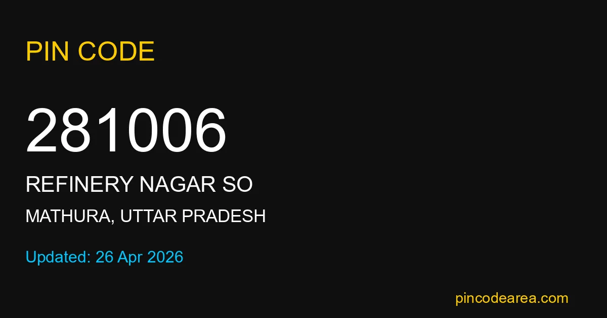 281006 PIN Code belongs to Refinery Nagar SO Post Office in Mathura district of Uttar Pradesh, India. This area mainly includes local residential and rural regions where India Post ensures timely mail and parcel delivery services.