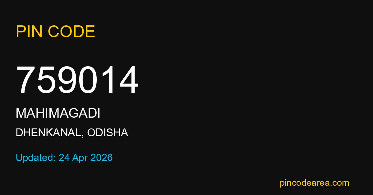 759014 PIN Code is assigned to Mahimagadi Post Office located in Dhenkanal district of Odisha. It helps in identifying the exact delivery area.