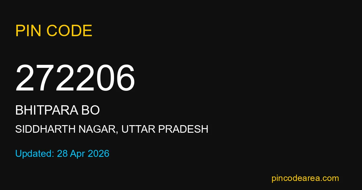 272206 PIN Code is assigned to Bhitpara BO Post Office located in Siddharth Nagar district of Uttar Pradesh. It helps in identifying the exact delivery area.