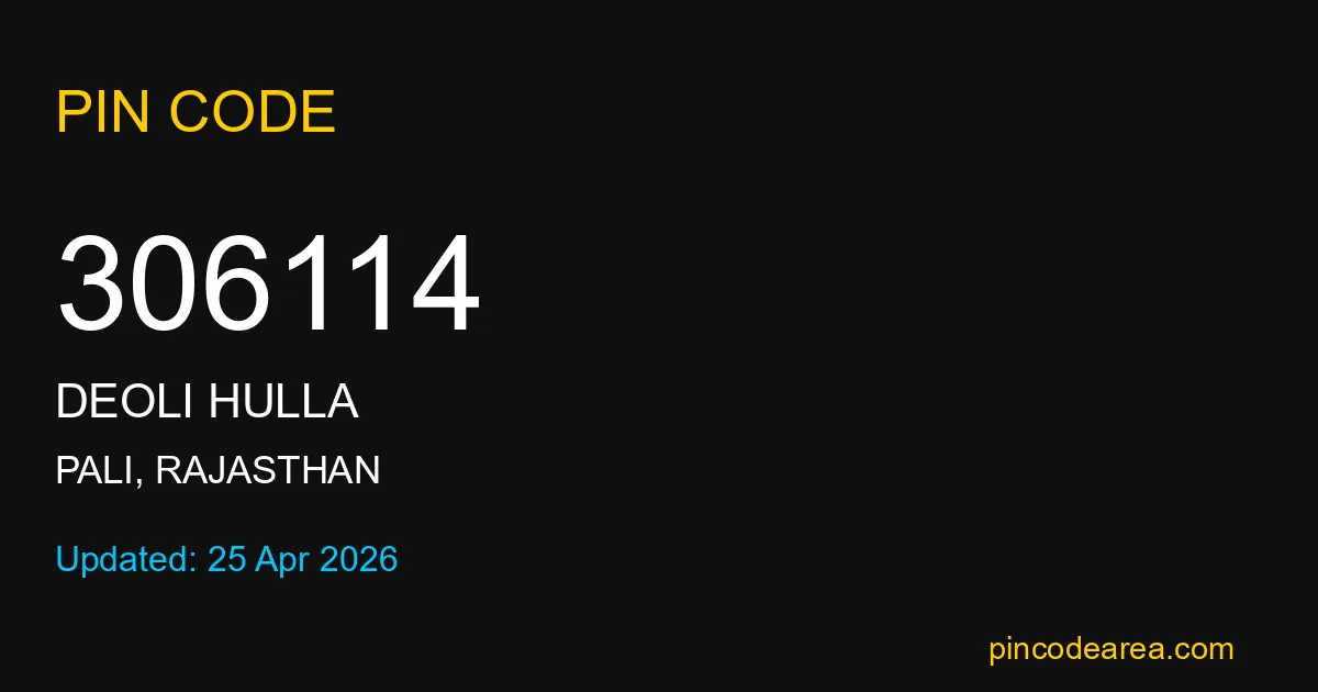 306114 PIN Code belongs to Deoli Hulla Post Office in Pali district of Rajasthan, India. This area mainly includes local residential and rural regions where India Post ensures timely mail and parcel delivery services.