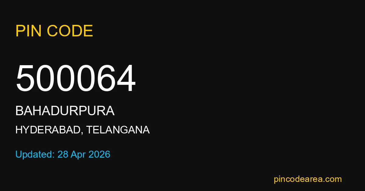 500064 PIN Code is assigned to Bahadurpura Post Office located in Hyderabad district of Telangana. It helps identify the exact delivery area for postal and courier services.