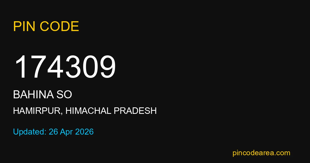 174309 PIN Code belongs to Bahina SO Post Office in Hamirpur district of Himachal Pradesh, India. This area mainly includes local residential and rural regions where India Post ensures timely mail and parcel delivery services.