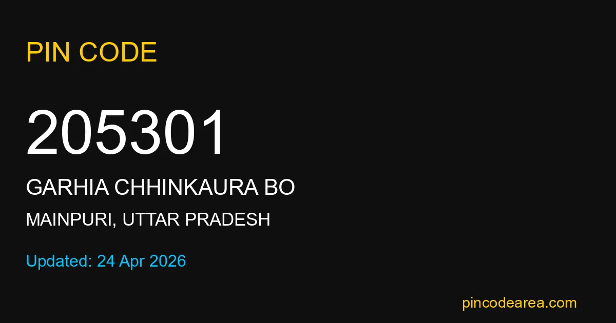 205301 PIN Code is assigned to Garhia Chhinkaura BO Post Office located in Mainpuri district of Uttar Pradesh. It helps in identifying the exact delivery area.