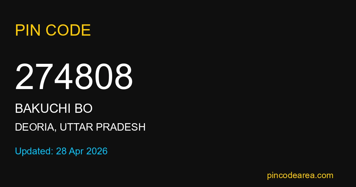 274808 PIN Code is assigned to Bakuchi BO Post Office located in Deoria district of Uttar Pradesh. It helps identify the exact delivery area for postal and courier services.