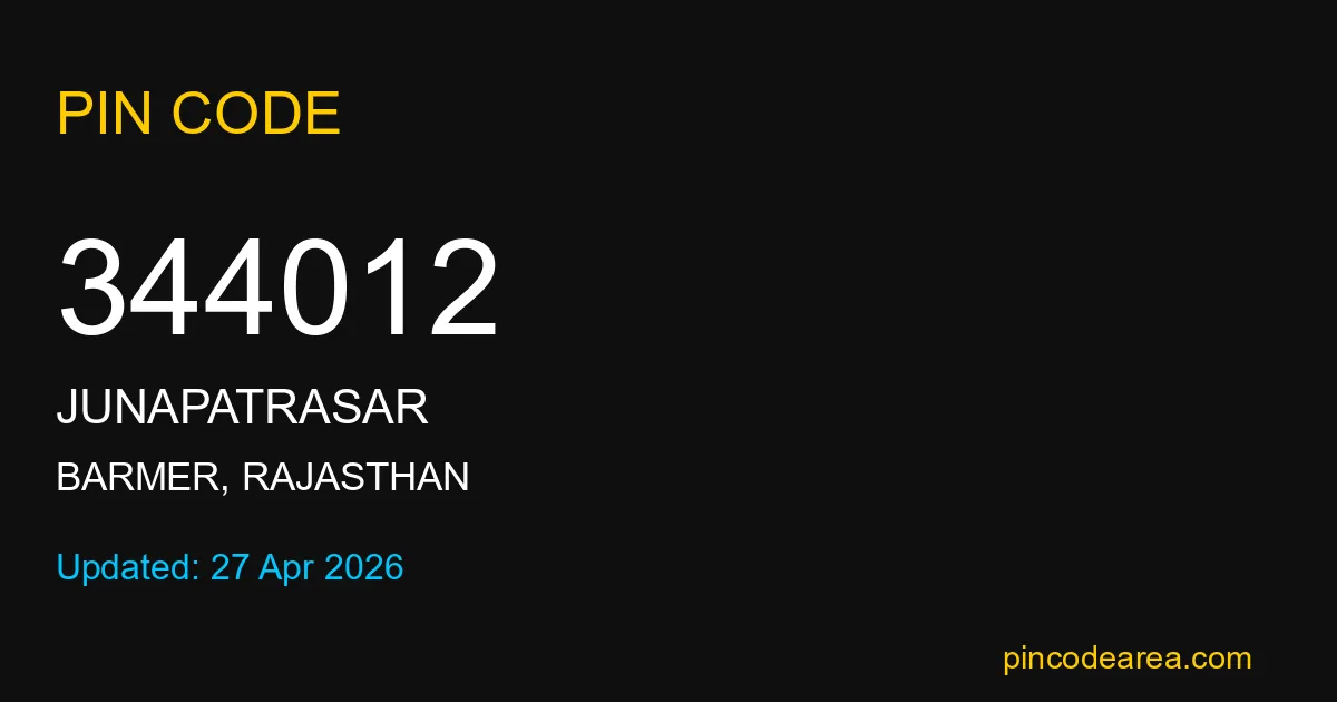 344012 PIN Code is assigned to Junapatrasar Post Office located in Barmer district of Rajasthan. It helps identify the exact delivery area for postal and courier services.