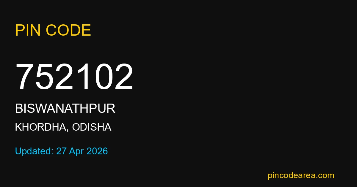 752102 PIN Code is assigned to Biswanathpur Post Office located in Khordha district of Odisha. It helps in identifying the exact delivery area.
