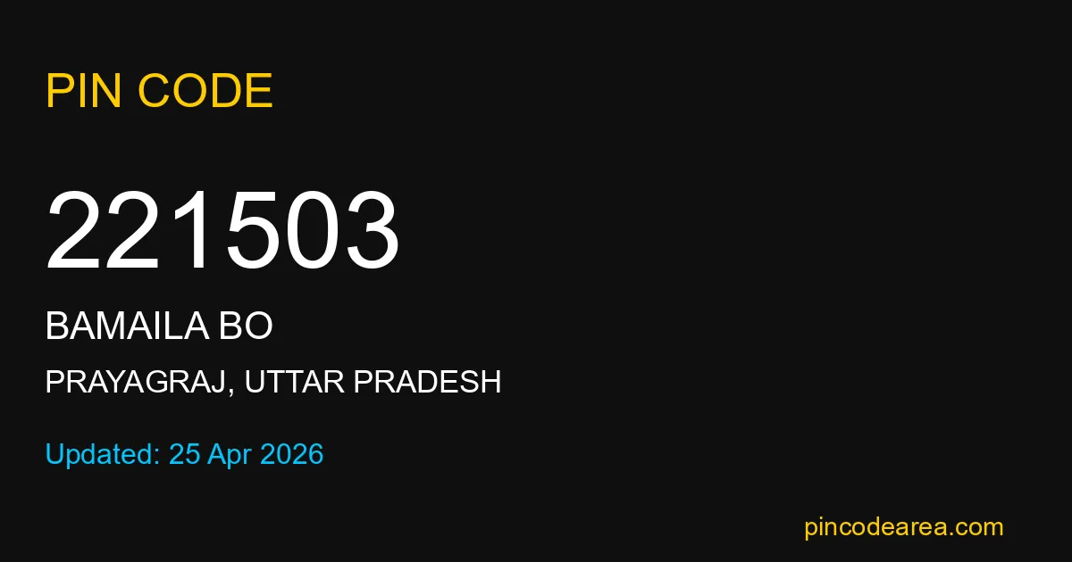 221503 PIN Code is assigned to Bamaila BO Post Office located in Prayagraj district of Uttar Pradesh. It helps in identifying the exact delivery area.