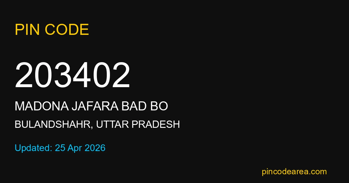203402 PIN Code is assigned to Madona Jafara Bad BO Post Office located in Bulandshahr district of Uttar Pradesh. It helps in identifying the exact delivery area.