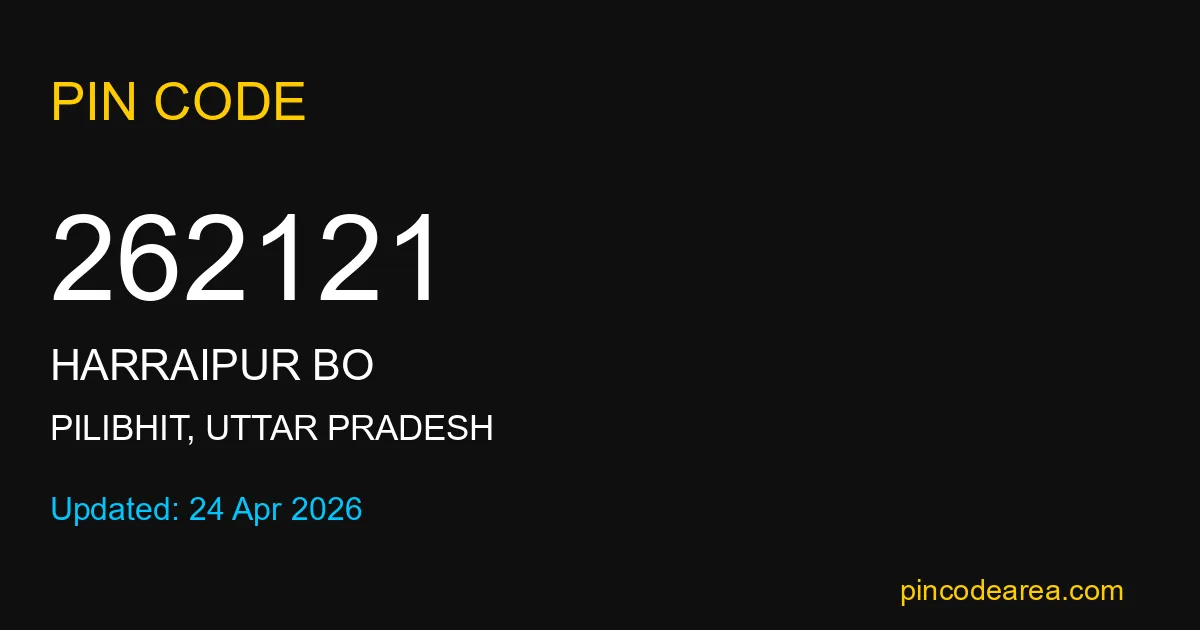 262121 PIN Code is assigned to Harraipur BO Post Office located in Pilibhit district of Uttar Pradesh. It helps in identifying the exact delivery area.