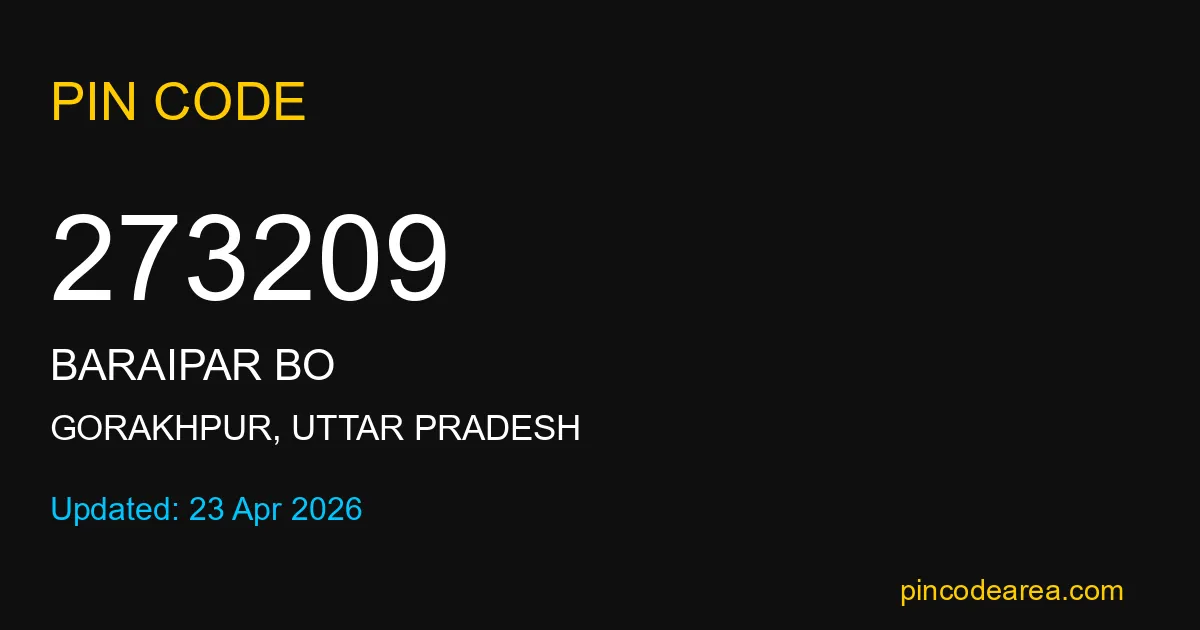 273209 PIN Code is assigned to Baraipar BO Post Office located in Gorakhpur district of Uttar Pradesh. It helps in identifying the exact delivery area.