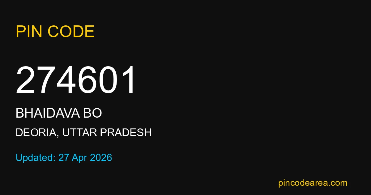 274601 PIN Code is assigned to Bhaidava BO Post Office located in Deoria district of Uttar Pradesh. It helps identify the exact delivery area for postal and courier services.