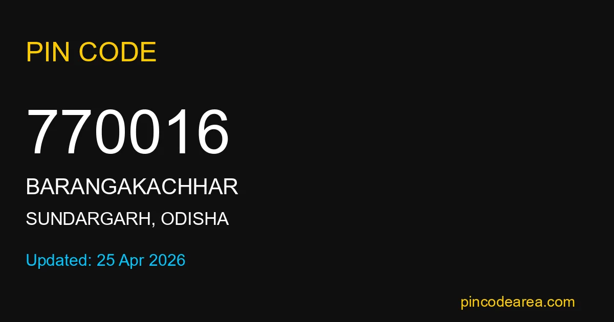 770016 PIN Code is assigned to Barangakachhar Post Office located in Sundargarh district of Odisha. It helps in identifying the exact delivery area.