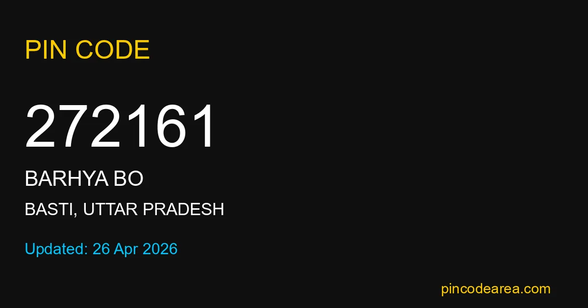 272161 PIN Code is assigned to Barhya BO Post Office located in Basti district of Uttar Pradesh. It helps identify the exact delivery area for postal and courier services.