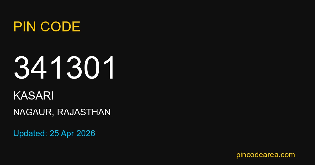 341301 PIN Code is assigned to Kasari Post Office located in Nagaur district of Rajasthan. It helps in identifying the exact delivery area.