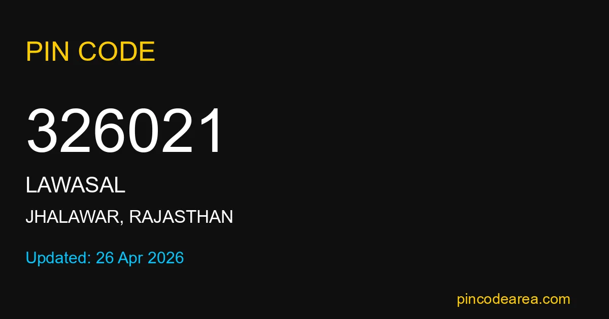 326021 PIN Code is assigned to Lawasal Post Office located in Jhalawar district of Rajasthan. It helps identify the exact delivery area for postal and courier services.