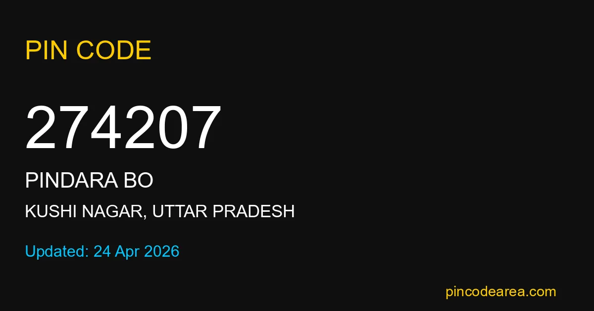 274207 PIN Code belongs to Pindara BO Post Office in Kushi Nagar district of Uttar Pradesh, India. This area mainly includes local residential and rural regions where India Post ensures timely mail and parcel delivery services.