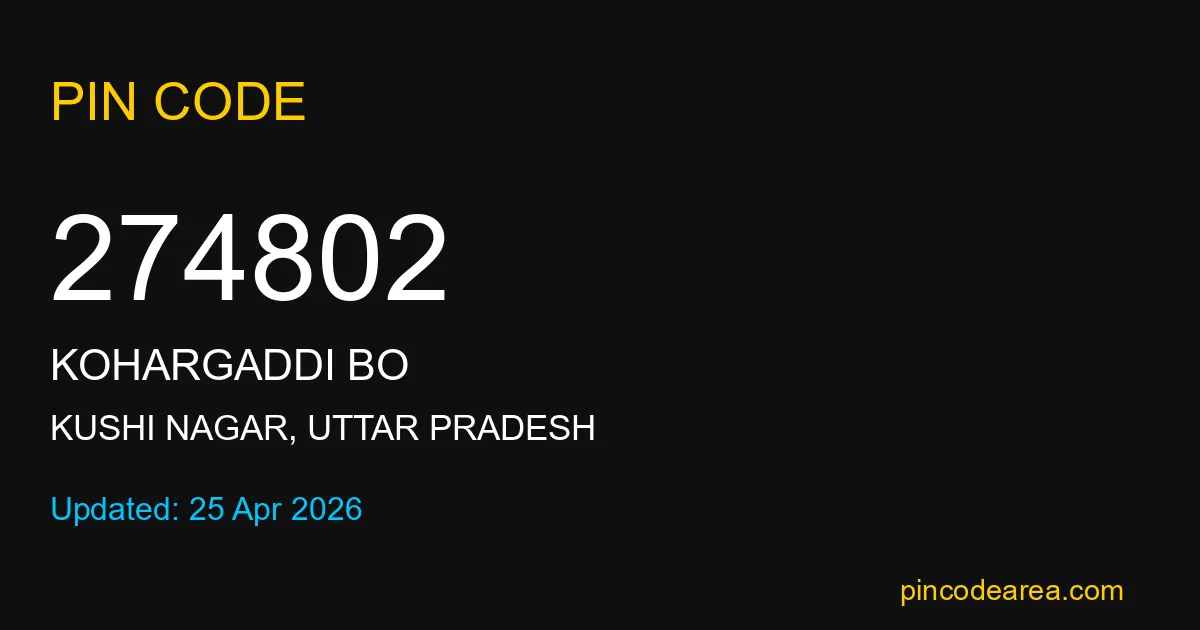 274802 PIN Code belongs to Kohargaddi BO Post Office in Kushi Nagar district of Uttar Pradesh, India. This area mainly includes local residential and rural regions where India Post ensures timely mail and parcel delivery services.