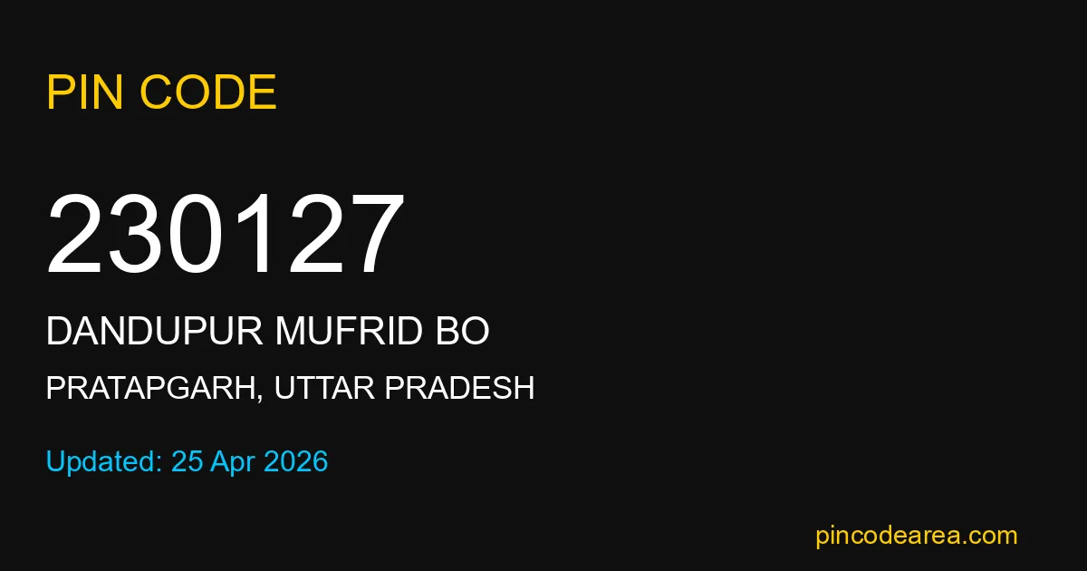 230127 PIN Code is assigned to Dandupur Mufrid BO Post Office located in Pratapgarh district of Uttar Pradesh. It helps in identifying the exact delivery area.