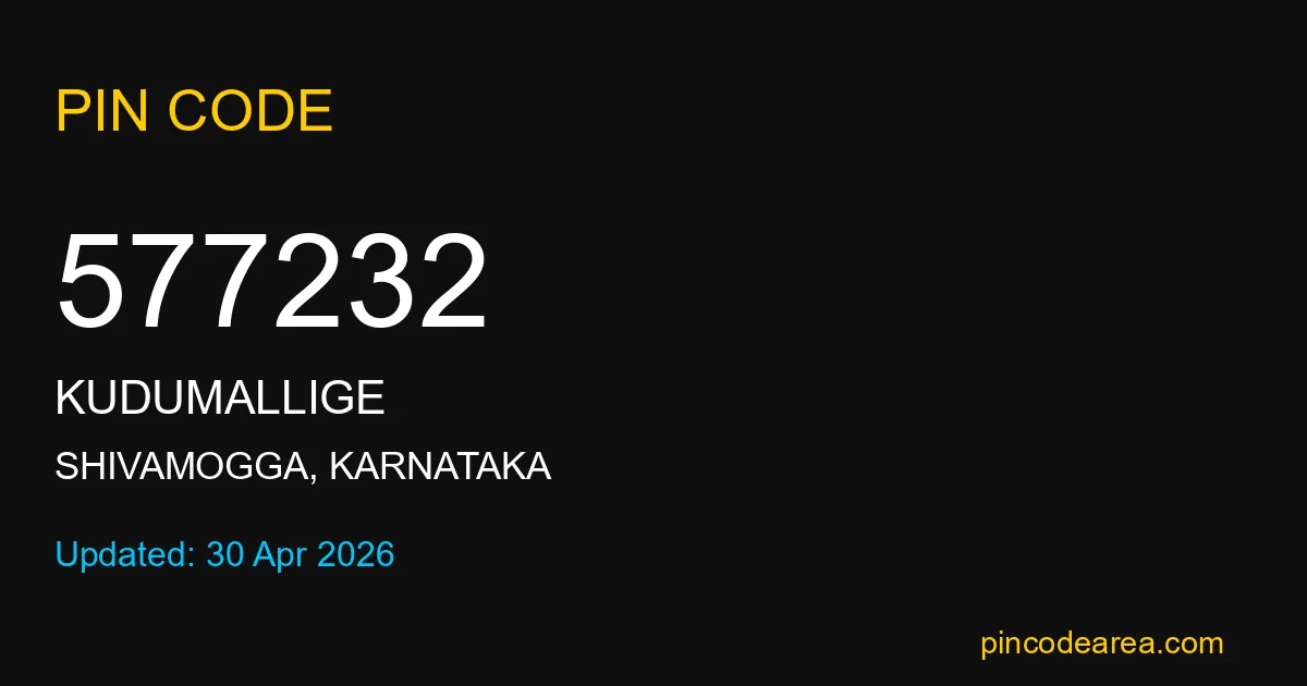 577232 PIN Code is assigned to Kudumallige Post Office located in Shivamogga district of Karnataka. It helps identify the exact delivery area for postal and courier services.