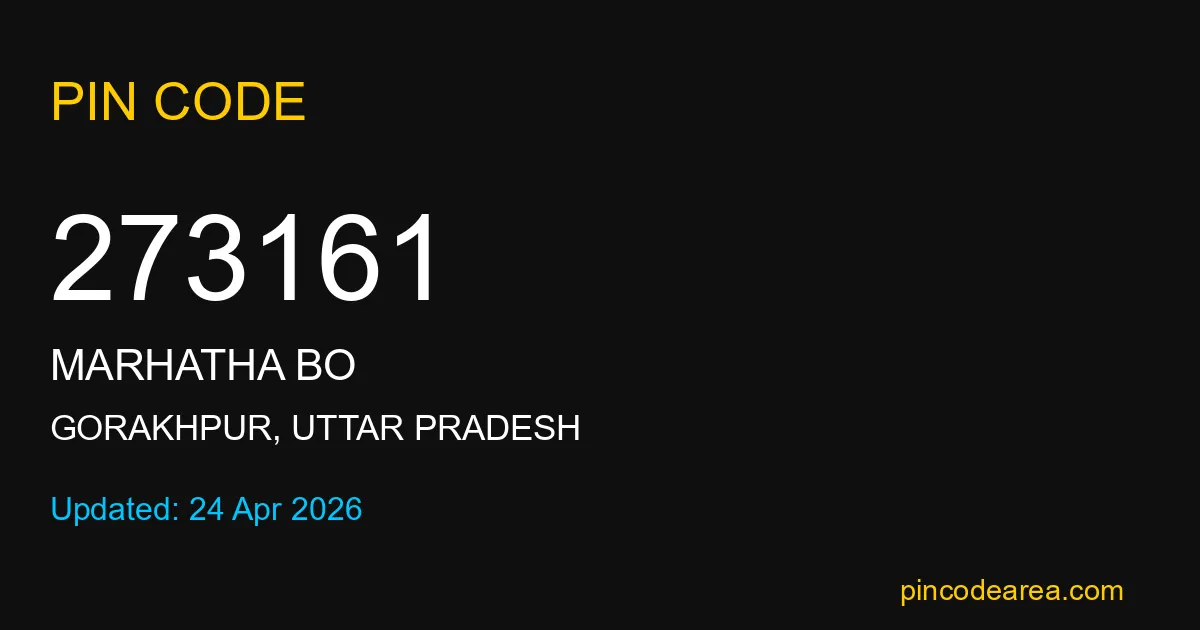 273161 PIN Code is assigned to Marhatha BO Post Office located in Gorakhpur district of Uttar Pradesh. It helps in identifying the exact delivery area.