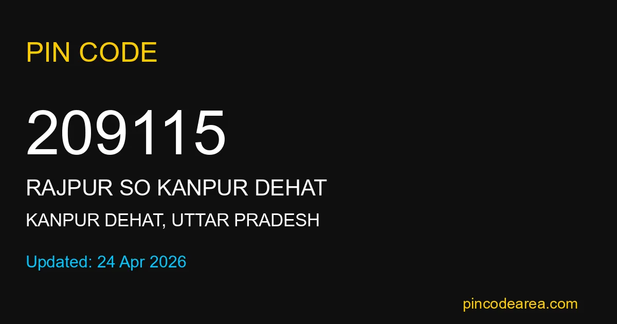 209115 PIN Code is assigned to Rajpur SO Kanpur Dehat Post Office located in Kanpur Dehat district of Uttar Pradesh. It helps in identifying the exact delivery area.
